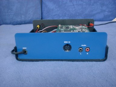 Hier die Rückseite des Gerätes. Da keine MIDI-Befehle von dem Gerät ausgegeben werden, gibt es hier nur einen MIDI-In Anschluß und natürlich einen Audio-Out.